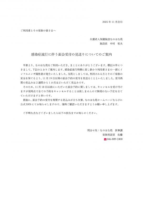 令和2年2月24日付けで行政より、面会については可能な限り制限するよう通達がありました。