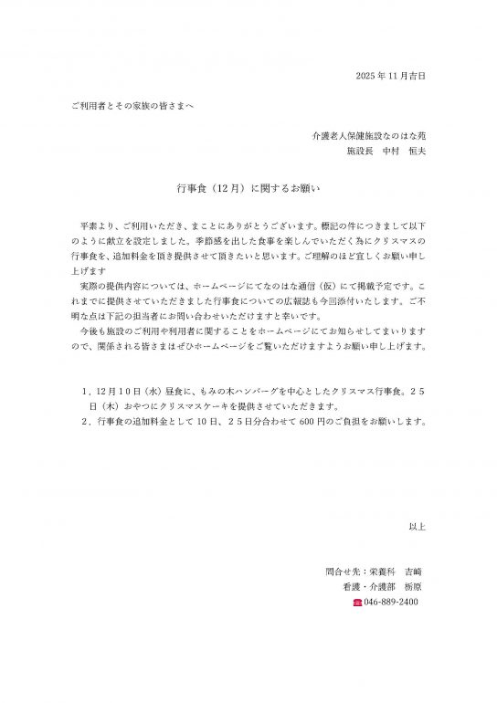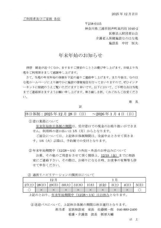 平素より、入所及び通所リハビリテーションご利用の皆さま、関係者へお知らせいたします。