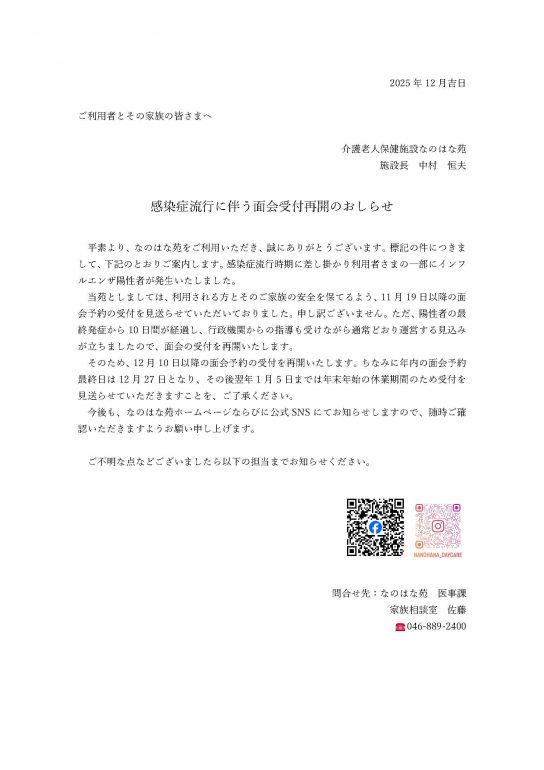 令和6年12月に発生しました苑内の感染症発生状況について、お知らせいたします。去る12月25日以降の新型コロナウィルス感染症の陽性者は発生せず、インフルエンザに関しても1月6日現在、陽性者はおりません。そこで、感染症のまん延を防止しつつ面会を通常どおり再開させていただくこととしました。