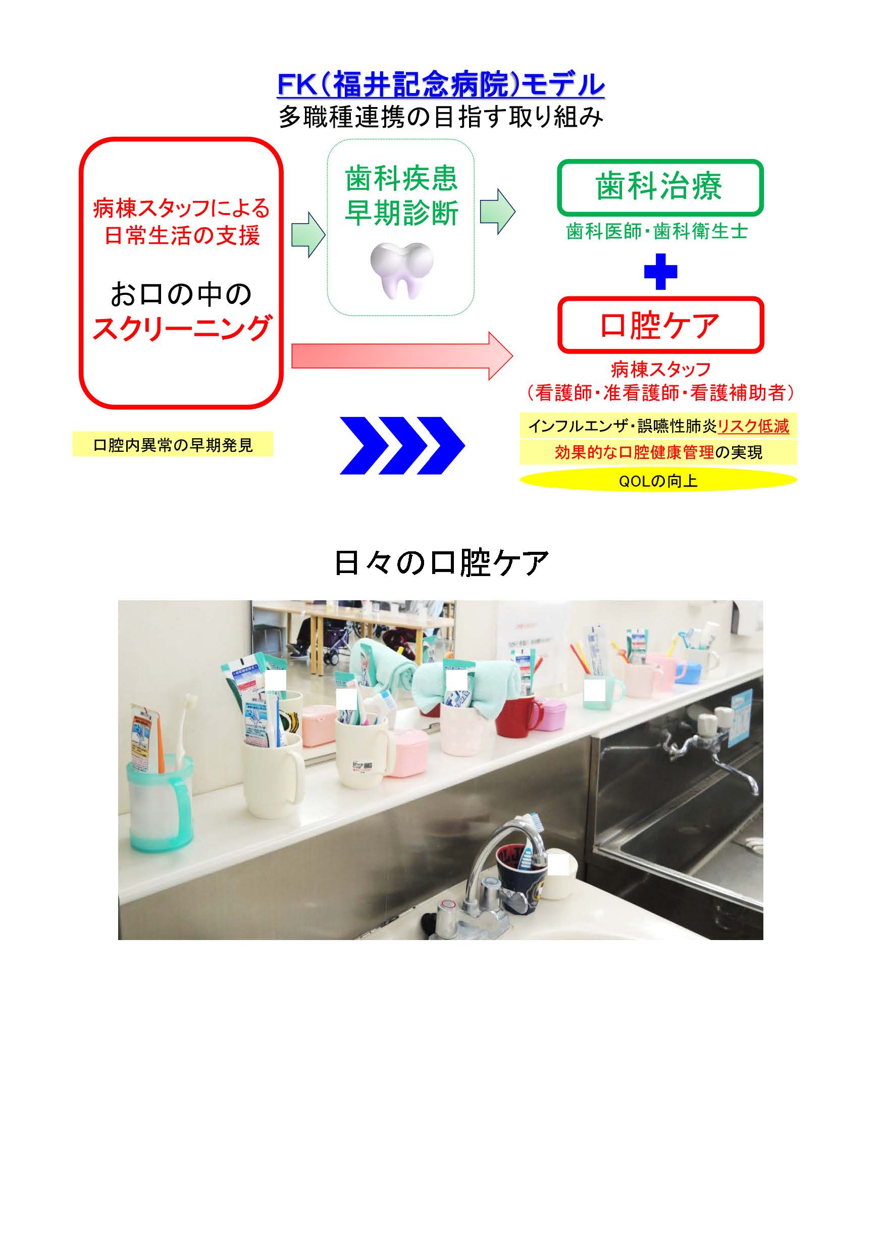 当院歯科では、歯科医師、歯科衛生士のほか、医師、看護スタッフ、リハビリスタッフ、管理栄養士等が、それぞれの専門性をもって緊密に連携し、認知症病棟、精神科病棟にご入院中のみなさまへのお口の管理を積極的に行います。むし歯、歯周病、入れ歯、かぶせもの、飲み込みの検査など、ほぼすべての一般歯科治療に対応しております。