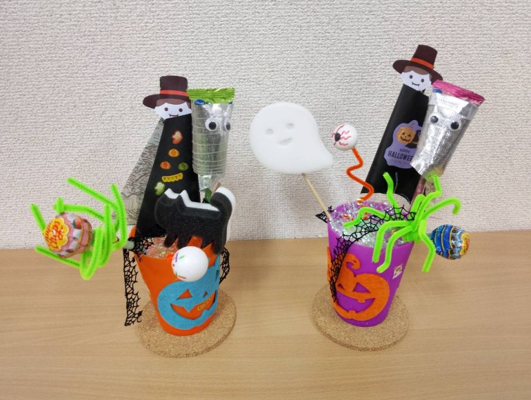 ドラキュラはスティックコーヒー、クモはチュッパ○ャップス、ミイラ男は飴・・と工夫をしてHallowe’enアートの完成(∩´∀`)∩