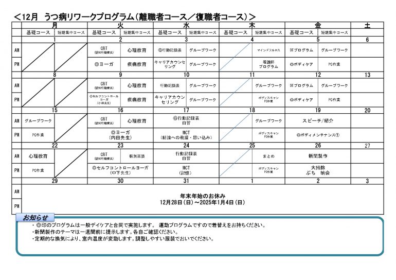 - ポストリワーク:短期集中コース終了後、復職までの期間プログラムに参加すること。プログラム終了後、復職までもう少し準備期間が欲しい方や、通勤訓練や慣らし勤務と並行しての利用希望の方にご利用いただけます。
