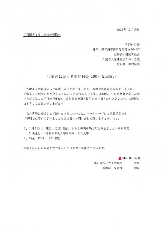 平素より、入所及び通所リハビリテーションご利用の皆さま、関係者へお知らせいたします。