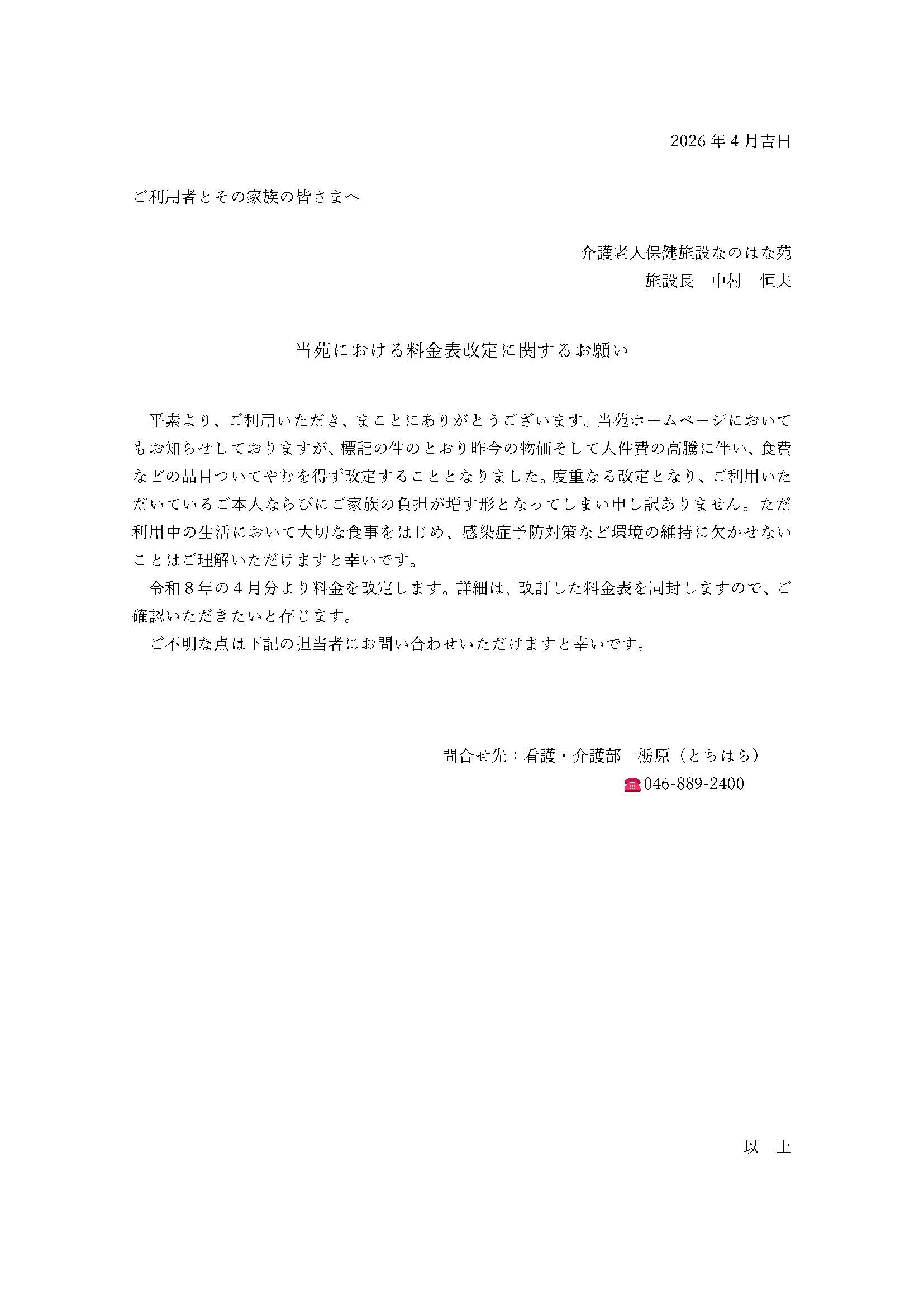 施設 居住費 値上げのお知らせ